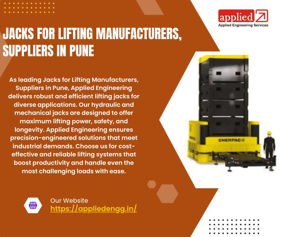 Jacks for Lifting â As leading Jacks for Lifting Manufacturers, Suppliers in Pune, Applied Engineering delivers robust and efficient lifting jacks for diverse applications. Our hydraulic and mechanical jacks are designed to offer maximum lifting power, safety, and longevity. Applied Engineering ensures precision-engineered solutions that meet industrial demands. Choose us for cost-effective and reliable lifting systems that boost productivity and handle even the most challenging loads with ease.