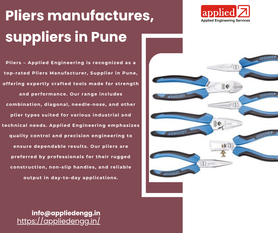 Pliers â Applied Engineering is recognized as a top-rated Pliers Manufacturer, Supplier in Pune, offering expertly crafted tools made for strength and performance. Our range includes combination, diagonal, needle-nose, and other plier types suited for various industrial and technical needs. Applied Engineering emphasizes quality control and precision engineering to ensure dependable results. Our pliers are preferred by professionals for their rugged construction, non-slip handles, and reliable output in day-to-day applications.