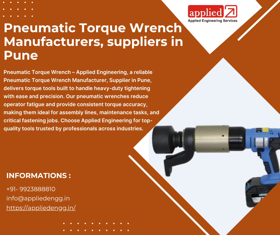 Pneumatic Torque Wrench â Applied Engineering, a reliable Pneumatic Torque Wrench Manufacturer, Supplier in Pune, delivers torque tools built to handle heavy-duty tightening with ease and precision. Our pneumatic wrenches reduce operator fatigue and provide consistent torque accuracy, making them ideal for assembly lines, maintenance tasks, and critical fastening jobs. Choose Applied Engineering for top-quality tools trusted by professionals across industries.