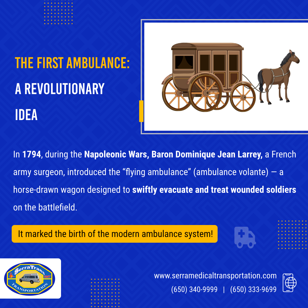 Did you know that the first formal ambulance system was created in 1794 during the Napoleonic Wars by Baron Dominique Jean Larrey, a French army surgeon? He introduced the “flying ambulance” (ambulance volante), a horse-drawn wagon designed to swiftly evacuate and treat wounded soldiers on the battlefield.