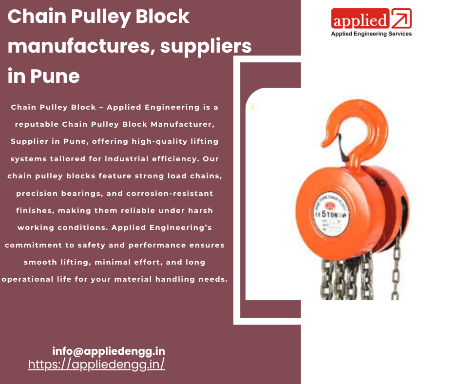 Chain Pulley Block – Applied Engineering is a reputable Chain Pulley Block Manufacturer, Supplier in Pune, offering high-quality lifting systems tailored for industrial efficiency. Our chain pulley blocks feature strong load chains, precision bearings, and corrosion-resistant finishes, making them reliable under harsh working conditions. Applied Engineering’s commitment to safety and performance ensures smooth lifting, minimal effort, and long operational life for your material handling needs.