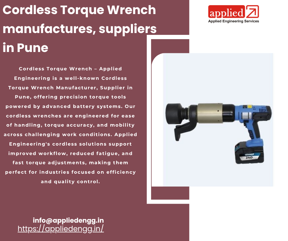 Cordless Torque Wrench â Applied Engineering is a well-known Cordless Torque Wrench Manufacturer, Supplier in Pune, offering precision torque tools powered by advanced battery systems. Our cordless wrenches are engineered for ease of handling, torque accuracy, and mobility across challenging work conditions. Applied Engineering's cordless solutions support improved workflow, reduced fatigue, and fast torque adjustments, making them perfect for industries focused on efficiency and quality control.