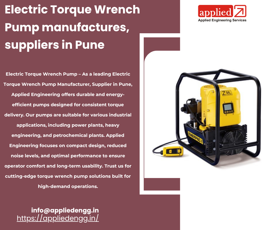 Electric Torque Wrench Pump â As a leading Electric Torque Wrench Pump Manufacturer, Supplier in Pune, Applied Engineering offers durable and energy-efficient pumps designed for consistent torque delivery. Our pumps are suitable for various industrial applications, including power plants, heavy engineering, and petrochemical plants. Applied Engineering focuses on compact design, reduced noise levels, and optimal performance to ensure operator comfort and long-term usability. Trust us for cutting-edge torque wrench pump solutions built for high-demand operations.
