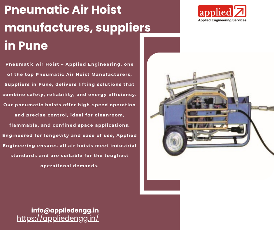 Pneumatic Air Hoist â Applied Engineering, one of the top Pneumatic Air Hoist Manufacturers, Suppliers in Pune, delivers lifting solutions that combine safety, reliability, and energy efficiency. Our pneumatic hoists offer high-speed operation and precise control, ideal for cleanroom, flammable, and confined space applications. Engineered for longevity and ease of use, Applied Engineering ensures all air hoists meet industrial standards and are suitable for the toughest operational demands.